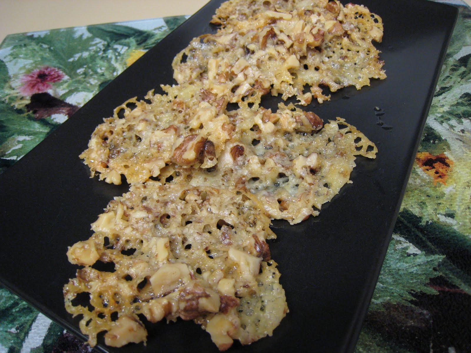 Simply grate the asiago, crumble the blue cheese, and chop the nuts. Place on a parchment paper lined baking sheet and bake at 300 for approximately 10 minutes.
