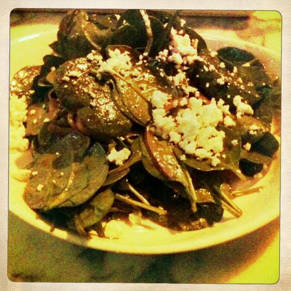 We split a spinach salad. I got snap happy with my hipstamatic app, so I know this salad does not look amazing, but it sure did taste good. Especially for a veggie lover like me who is trying so very hard to find veggies on menus here in the south. Spinach, goat cheese, kalamata olives, red onion, and tomato. What’s not to love? And, one thing I particularly appreciated was that there was no problem splitting the salad. Our waitress had it split in the kitchen and served on two plates. Thank you so much for that.