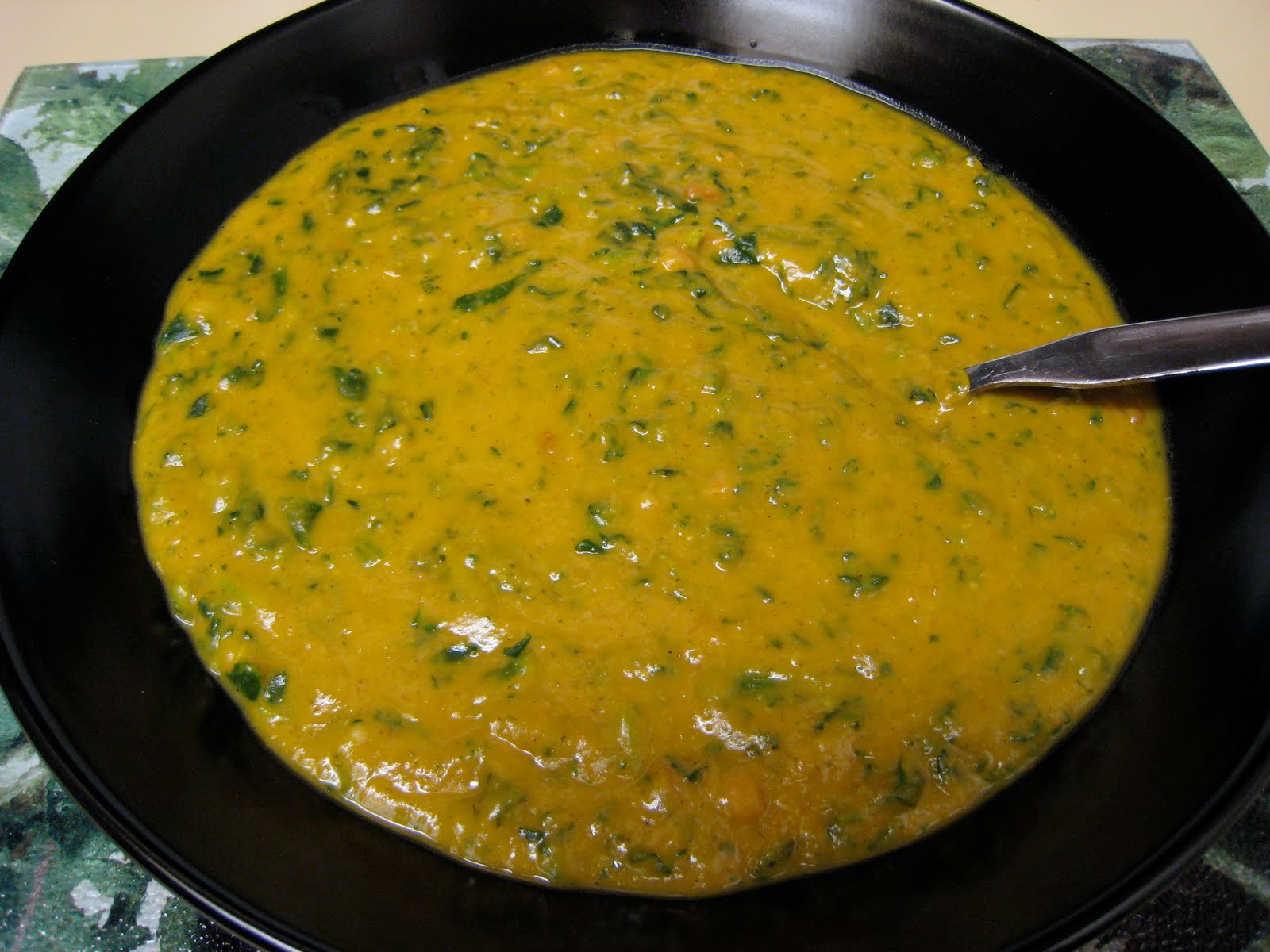 Next, pour it back into the pot, turn the burner to medium high again, and add the peanut butter, soy sauce, curry powder, and sweet soy sauce. When it is hot and the peanut butter is evenly distributed, add the spinach and cayenne. Bring the soup close to a boil, remove from heat, and serve. I served this with coconut basmati rice and peas.