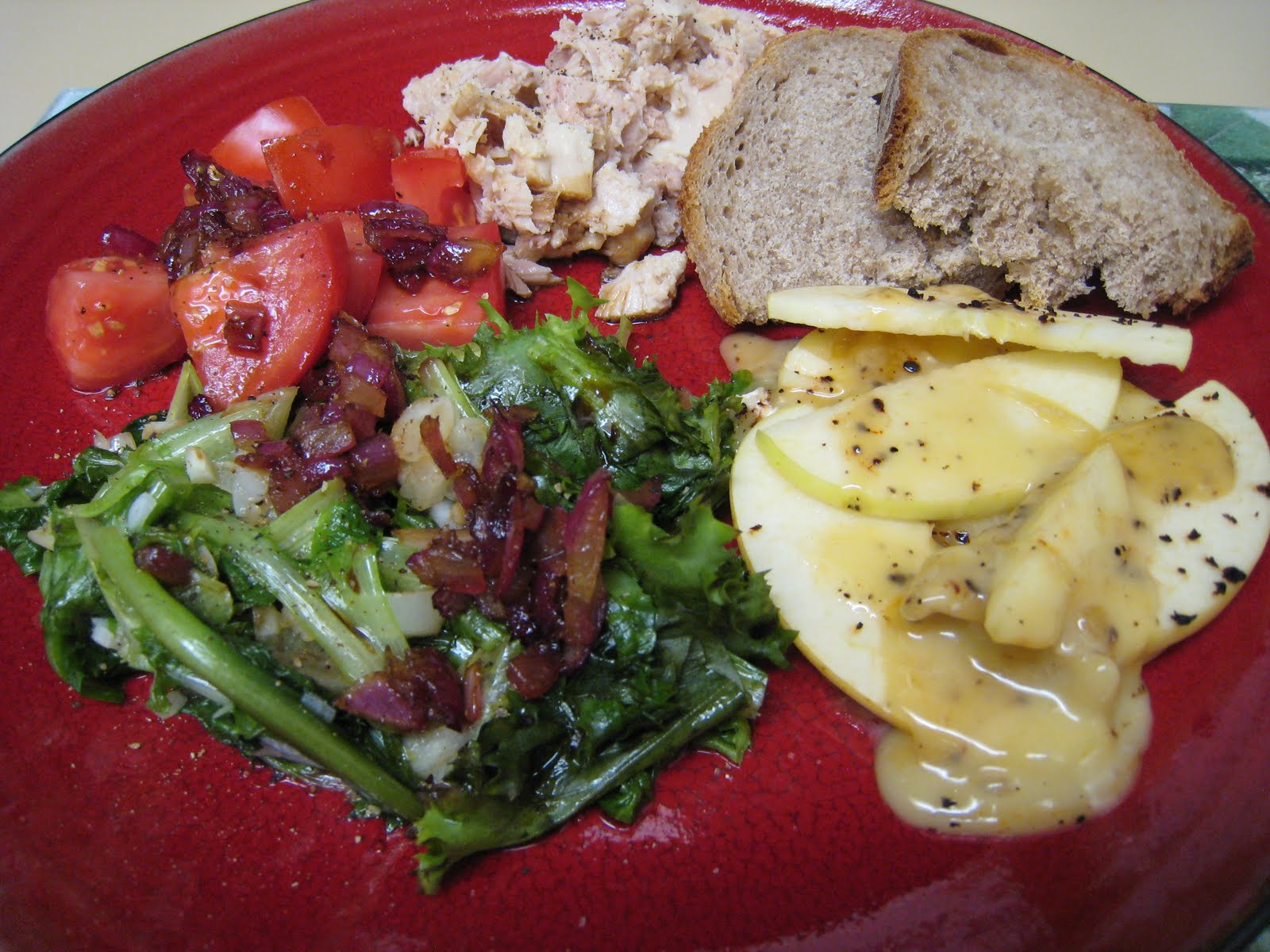 Wilted frisee and chopped tomato with onion balsamic dressing, real fisherman caught and former fisherman’s wife canned tuna, sliced rye, and baked apples with brie.