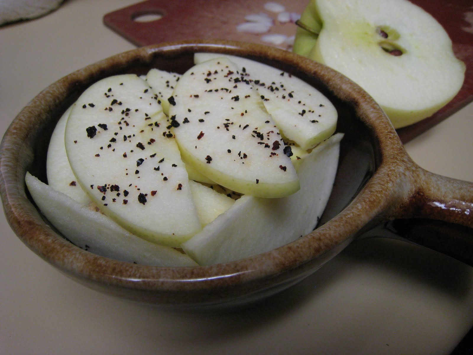 I sliced half of a golden delicious apple and layered it with some brie and Urfa Crushed Red Pepper Flakes (also known as Isot pepper). If you don’t know what Urfa pepper is, you can find out at Savory Spice Shop. Assuming you don’t have any at home… I would crack some fresh black pepper and add a pinch of red pepper flakes. Or, better yet… go to their website and buy some. Why not?