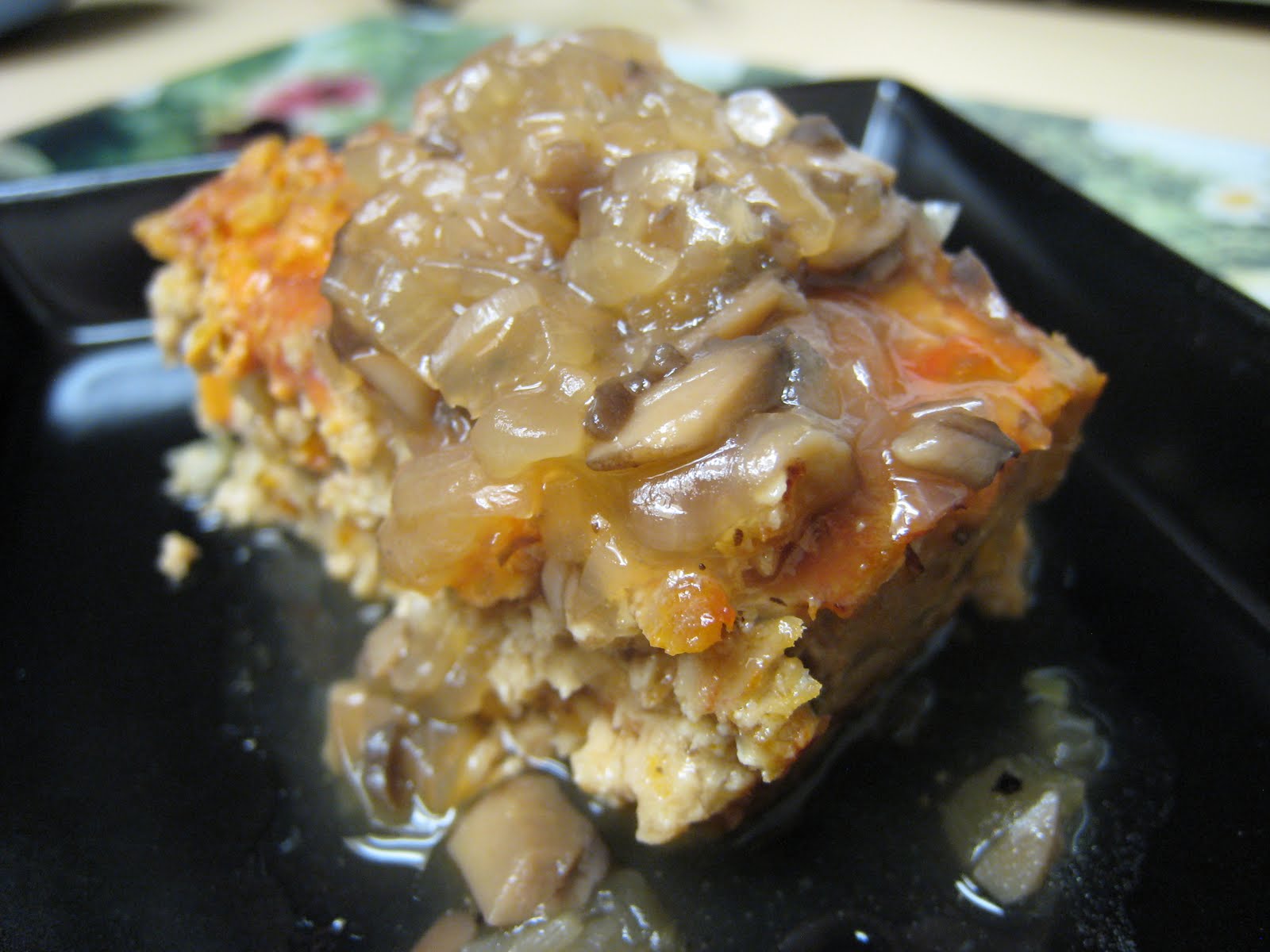 When the onion mixture cools completely, mix it by hand with a cup of parmesan cheese, 2 TB olive oil, and two whole eggs into the ground turkey. Break up a cup or a cup and a half of French or Italian bread (bakery-fresh bread is best) and add it to the turkey mixture. Transfer this to an olive-oiled Pyrex baking dish, brush the top with a couple spoons full of tomato sauce, and bake at 425 for 10 minutes. Then drop the temperature to 375 and bake until it reaches 180 degrees in the center, approximately an hour.